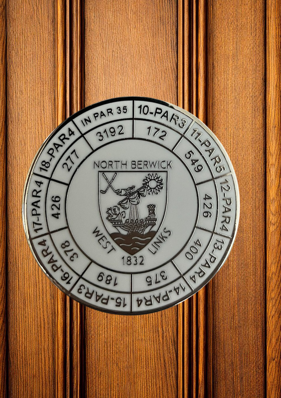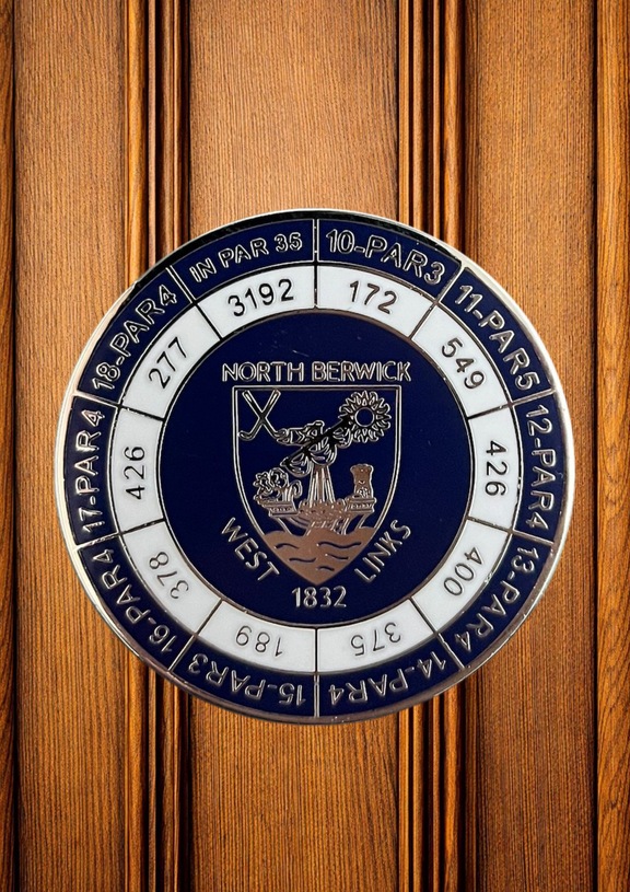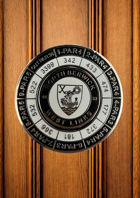 This ball marker has the yardages of the holes on the West Links on the outer edge of both sides of this stylish oversized marker. The removeable double sided standard marker within the centre makes this a very usable souvenir.