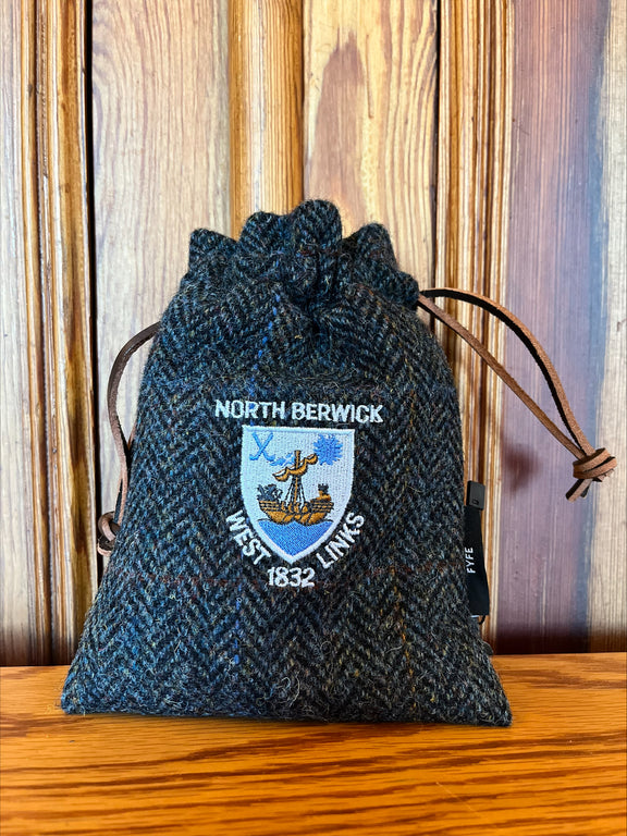 Introducing the Five Glens Drawstring Valuables Pouch, a meticulously handcrafted golf essential that showcases an East Lothian inspired herringbone pattern fabricated in Harris Tweed. With its secure drawstring closure, this pouch is perfect for safeguarding your valuables during a round, or you can use it as a convenient ball and tee bag. The finishing touch comes in the form of a premium leather drawstring, ensuring both style and functionality.