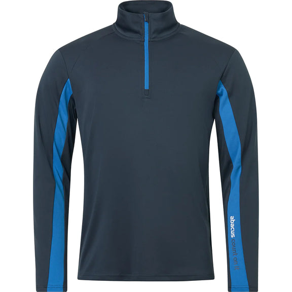 Cypress halfzip longsleeve in Ocean is made of a very stretchy, lightweight fabric with DryCool effects. The zipper at front is in blue contrast colour. Blue contrast stripes along sleeves and across back. Abacus logos at back neck below collar and along left sleeve. This sweater is perfect as layer 1, but also a thin layer 2. Crested with our North Berwick West Links logo in tonal threads on the left chest.